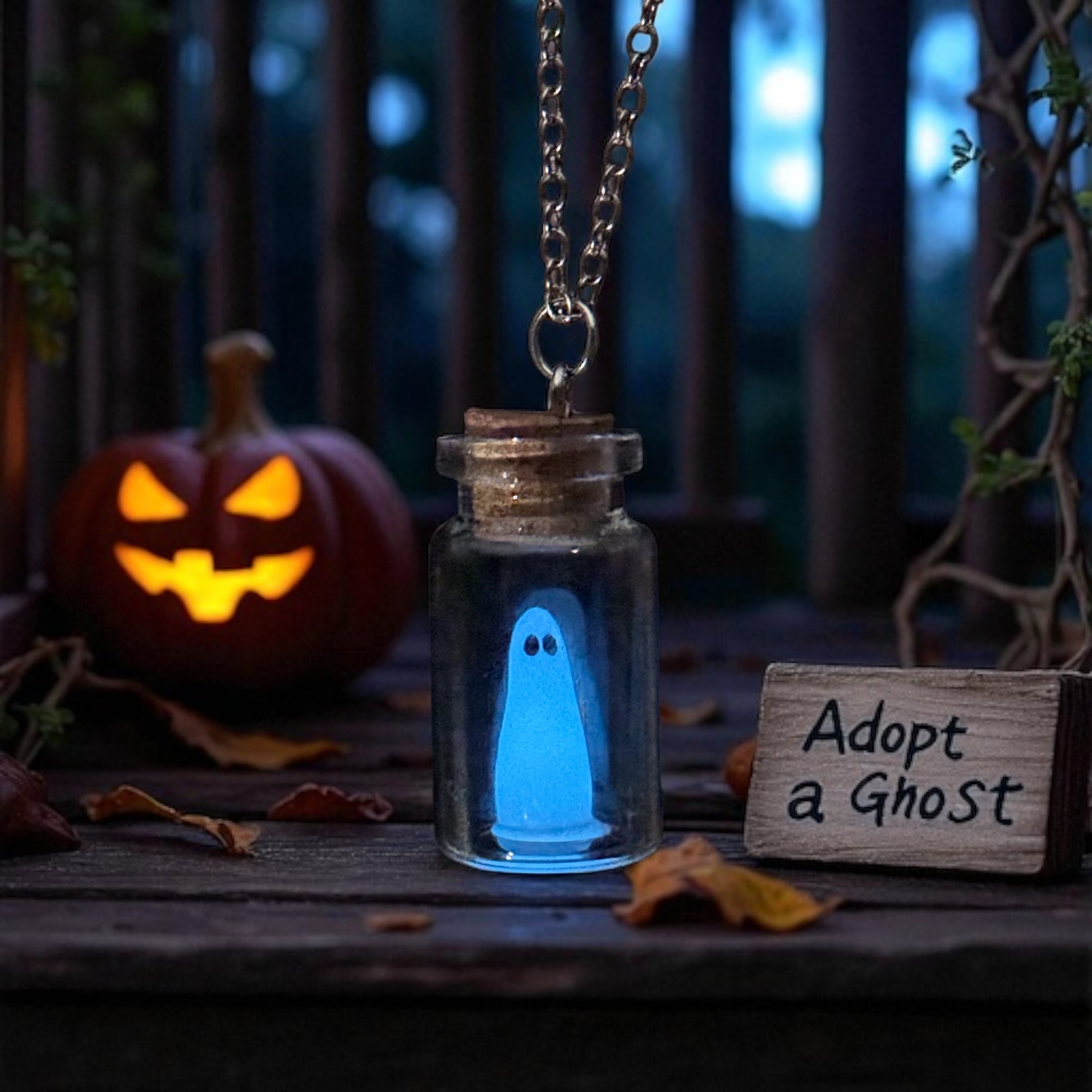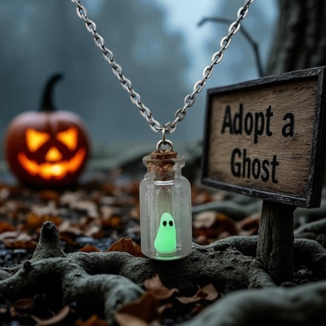 Capture a spirit of the season - literally! This eerie yet adorable Ghost in a Bottle Necklace features a tiny, handcrafted ghost sealed inside a miniature glass vial. Suspended on a cute delicate chain, it's the perfect blend of spooky and sweet.