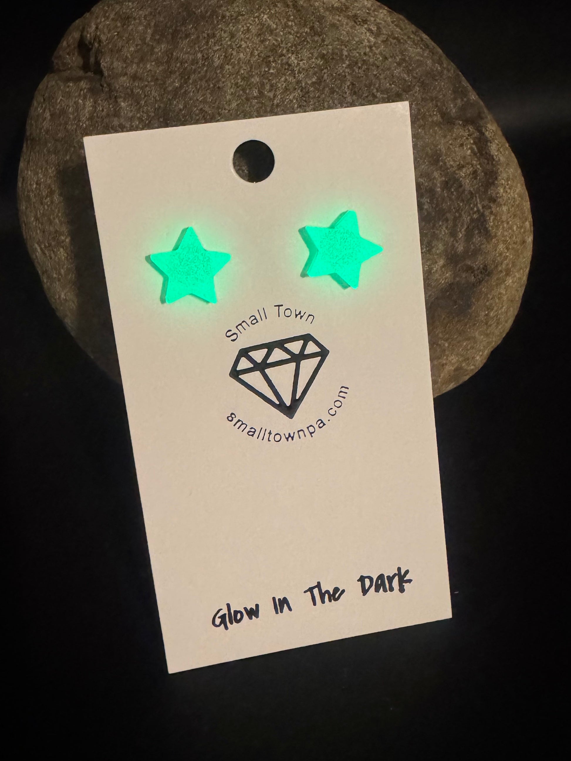 Shine day or night with these celestial inspired star studs that literally glow. Crafted for dreamers and night owls alike, these earrings are made from a luminous glow-in-the-dark material that charges in the light and radiates a soft glow in the dark. Lightweight and comfortable, they add a touch of magic to any outfit - whether you're stargazing, festival hopping, or just lighting up the room.