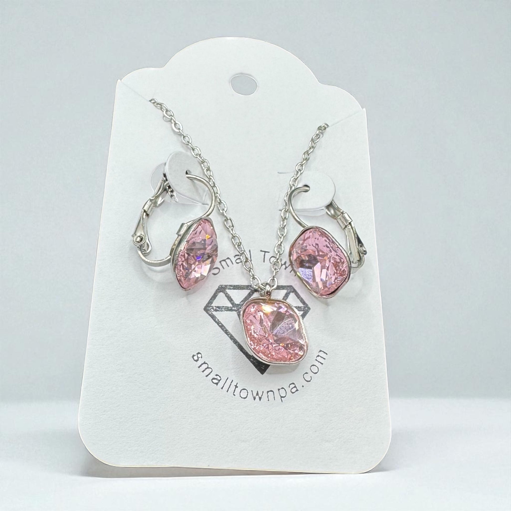 Add a touch of sparkle and sophistication with the Pink Ice Faceted Cut Earring and Necklace Set. Featuring radiant pink faceted stones that shimmer with every movement, this matching set brings a soft yet striking elegance to your look.